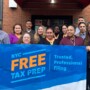 New York City tax team hold "free tax prep" sign.