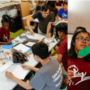 High school students in CFL’s Life Lines Visual Arts Troupe partnered with the Leroy Street Studio in a collaborative process of art, design, and installation to devise a method of providing shade for library-goers on brighter days. The team constructed a unique cascade of paper mobiles that hang across the large, vaulted windows. The shapes, made bold when backlit by the sun, speak to themes of togetherness, vitality, and natural beauty.